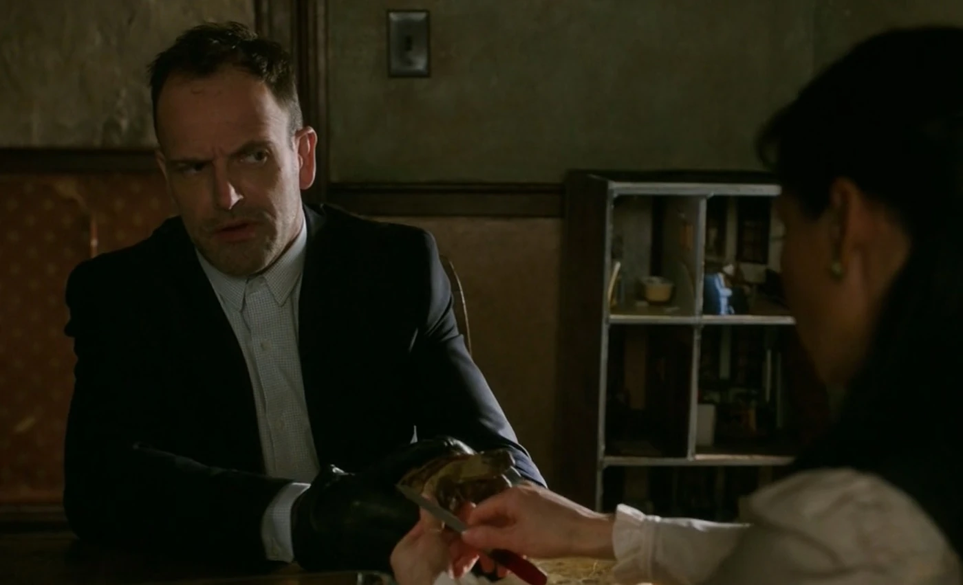 At 27:10, Watson is seen chopping vegetables and then feeds Clyde as she and Holmes discuss their case.[18] At 36:02, Clyde is seen crawling on the floor as Holmes has placed a venomous snake in his terrarium.[19] At 0:35, Clyde eats lettuce while Lin Wen compliments Watson on her scallion pancakes.[20]
