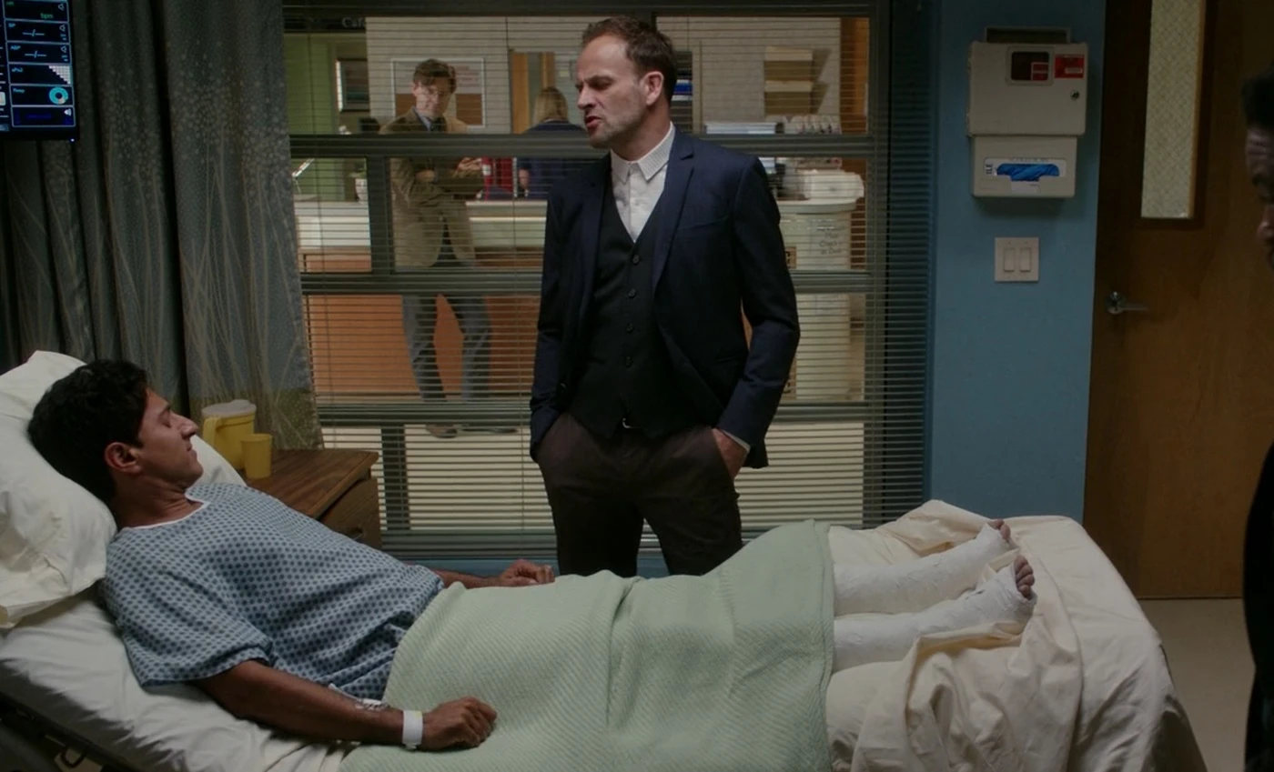 With Demopoulos watching intently through the hospital room's window, they say to Kapoor that he's not a suspect but want him to look afraid. Explaining that the recording when Reed was murdered was a phrase used at Greek funerals, familiar to the Greek Demopoulos, they confirm that Demopoulos sometimes covered for Reed and had sessions with Kapoor in which he provided information that could be used to profit on the stock market. The person who confirmed Demopoulos' alibi is an investment banker who is Demopoulos' partner in benefiting from Kapoor's information. They are hoping that their "theatre" with Kapoor will result in Demopoulos planting the murder weapon on someone. This will absolve Kapoor who would then be free to provide more lucrative information in his sessions with Demopoulos. Later at the Brownstone, Bell tells Watson that Demopoulos was caught retrieving the murder weapon. (♫ Aquilo - All I Ever Wanted ♫) She declines joining Bell at the precinct for the interrogation so that she can call an adoption attorney.